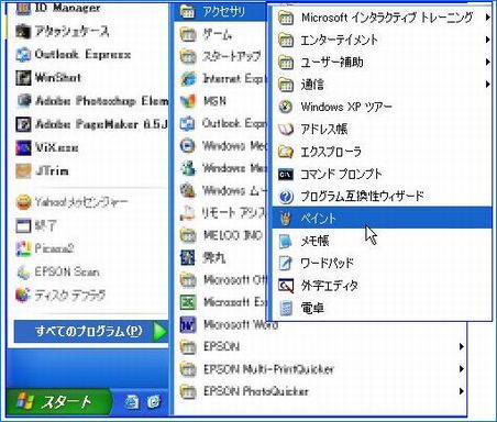 1、まず、「スタート」→「すべてのプログラム」→「アクセサリ」 →「ペイント」と進みます。そうしますと「ペイント」が起動します。 |