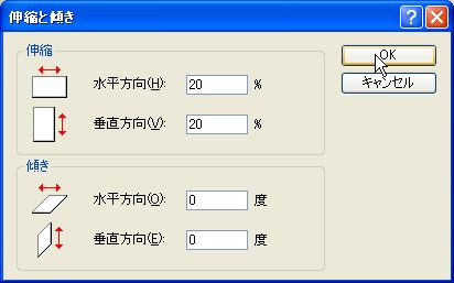 4、 「伸縮」の水平方向と垂直方向に数値を直接入力で入力します。 この数値は、元画像のピクセル数によって変わってくるはずです。 例えば、3264×2448の元画像でメールに添付したりするには、どのぐらいのサイズが最適かなと考えて20にしてみました。 20%ですと、この場合653×490でメールに添付しても受け取る方も、画像を見るときにウィンドウで全部見られますし、何よりも画像のファイルサイズ(KBやMB)が小さくなります。 |